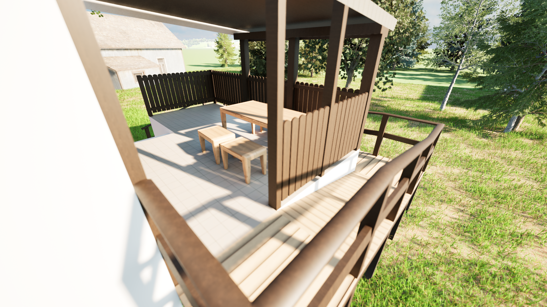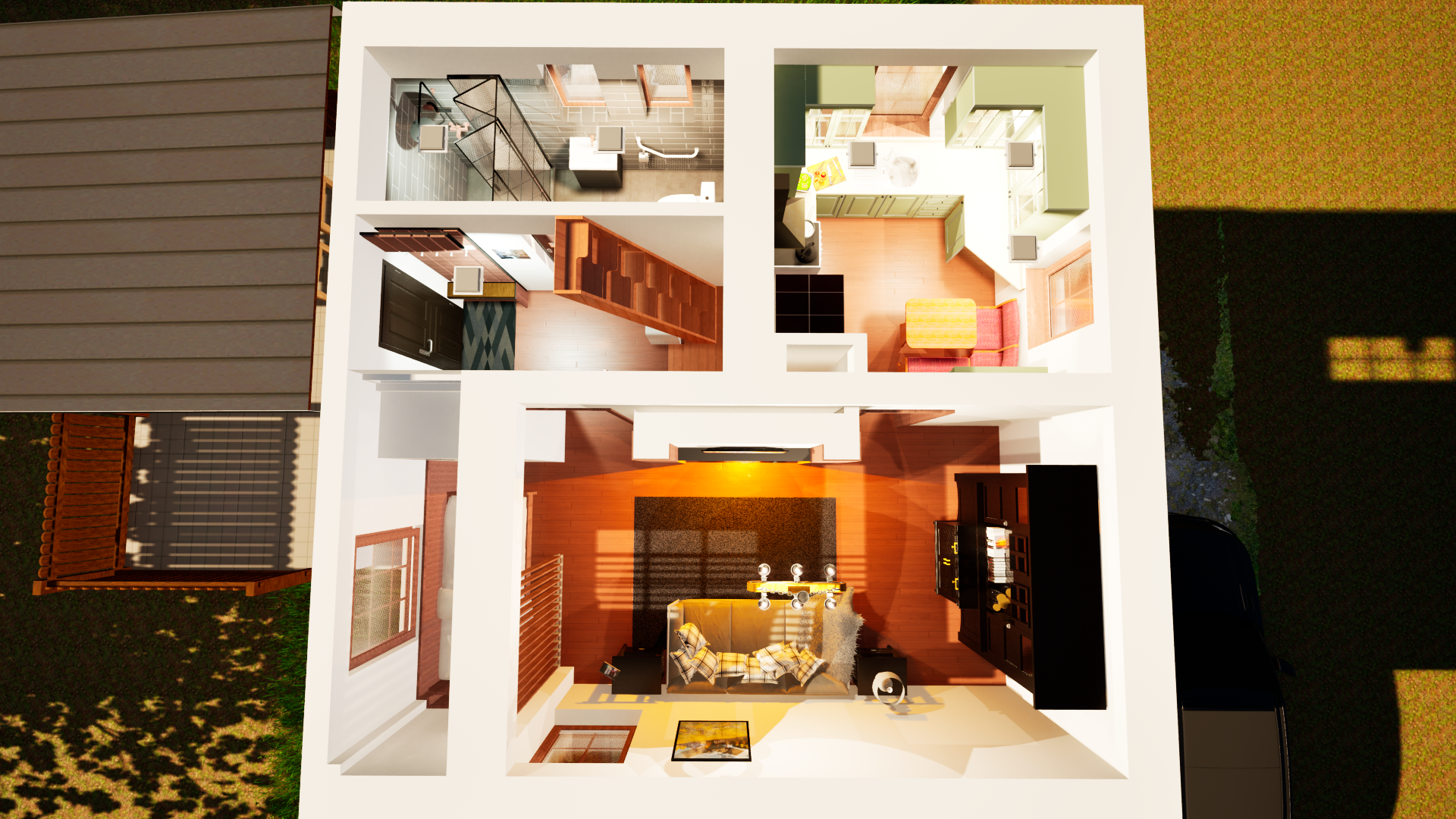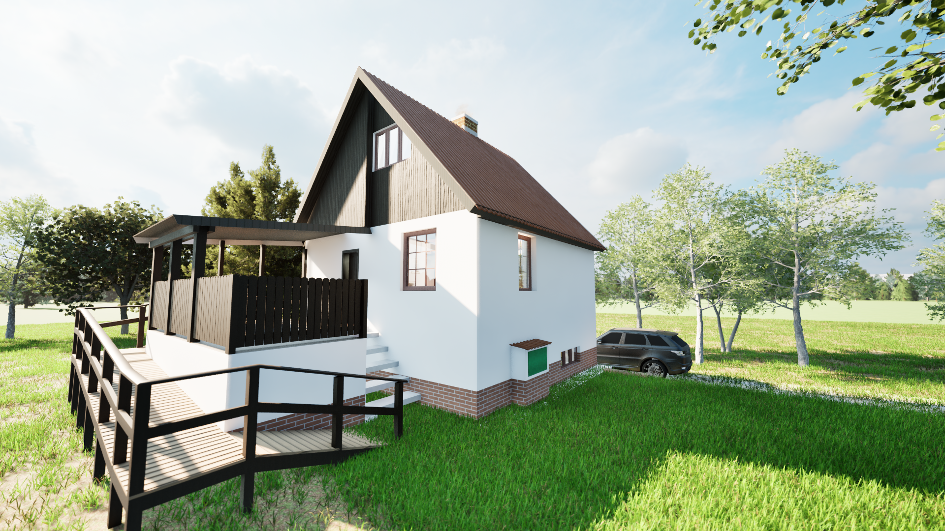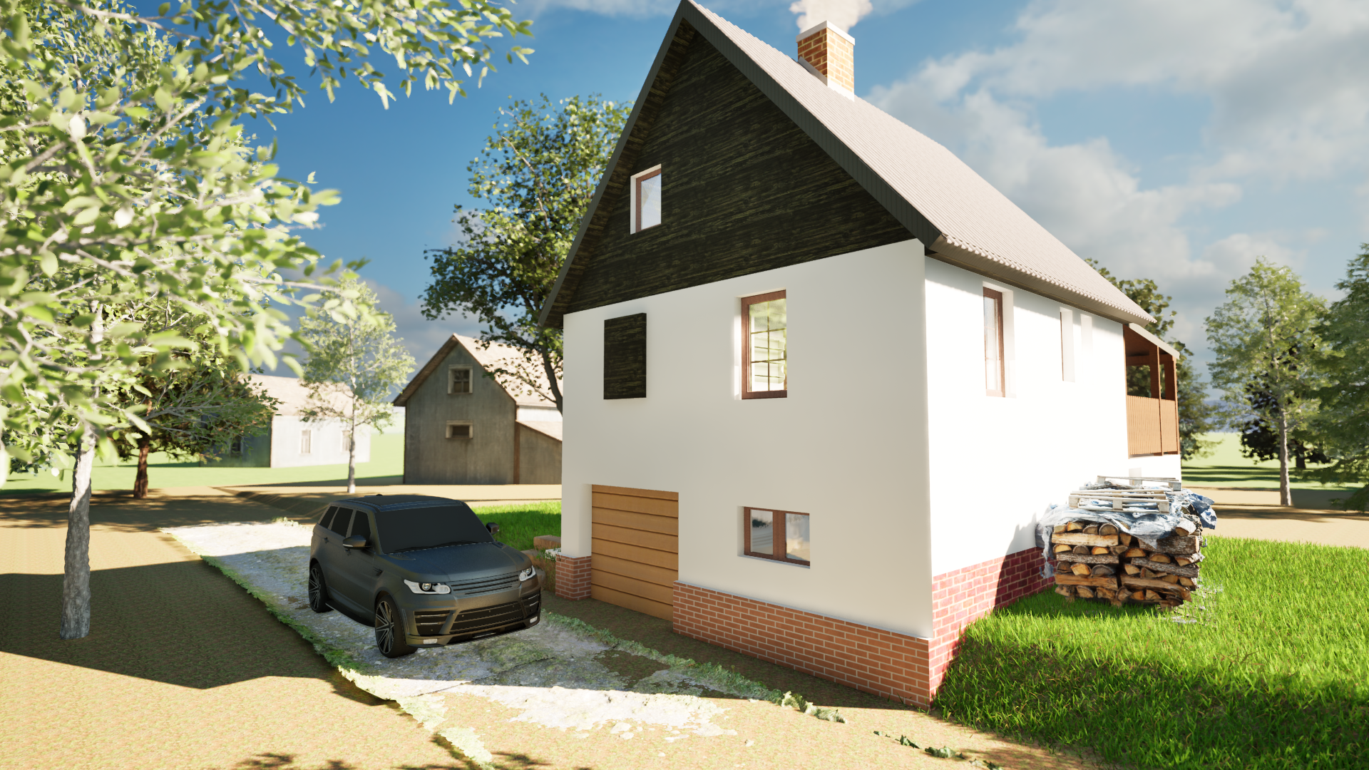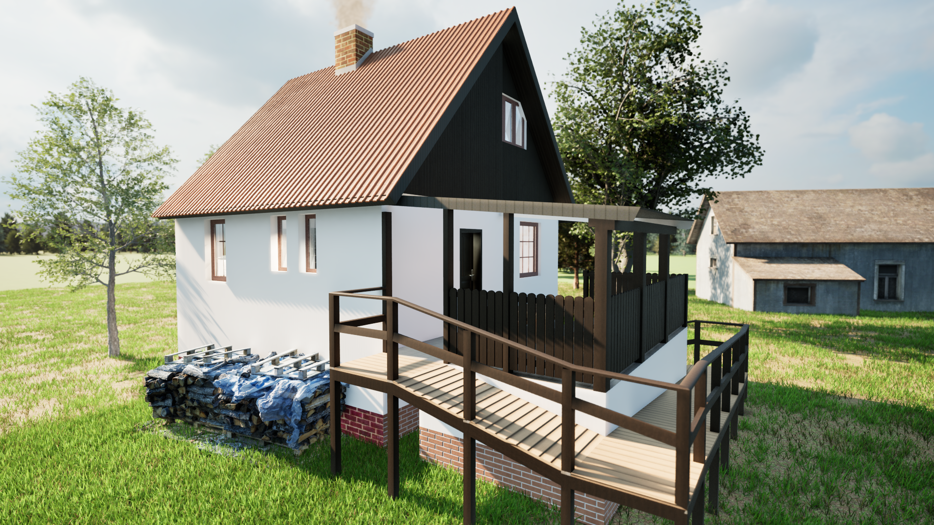 Rekonstrukce chaty – Jiřetín Po zkreslení stávající chaty a dle fotodokumentace jsem připravil prvotní návrh rekonstrukce a následné 2 varianty vizualizace.